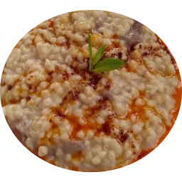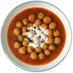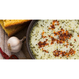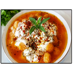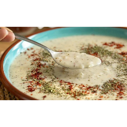 The sauce is prepared by mixing crushed yogurt and crushed garlic in a small bowl. This sauce is poured over the soup served on hot plates.