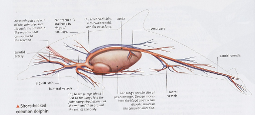 Dolphins have a closed circulatory system meaning that the blood in their bodies flows through veins and arteries in the body. Dolphins have a slower heartbeat so that the blood in their body has more time to warm up. Dolphins, since they are mammals pump blood much like humans. One difference however is that blood is first pumped into the retia mirabilia before it is transported to the brain.